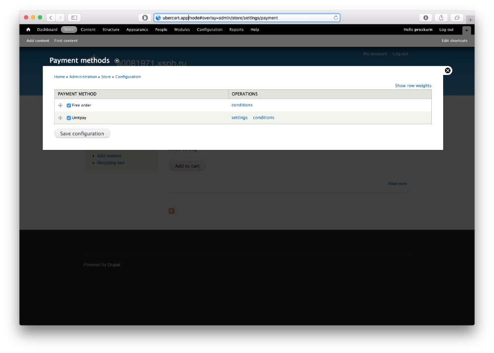 3. Перейдите в Store -> Payment methods и нажмите на ссылку "settings" напротив графы UnitPay.