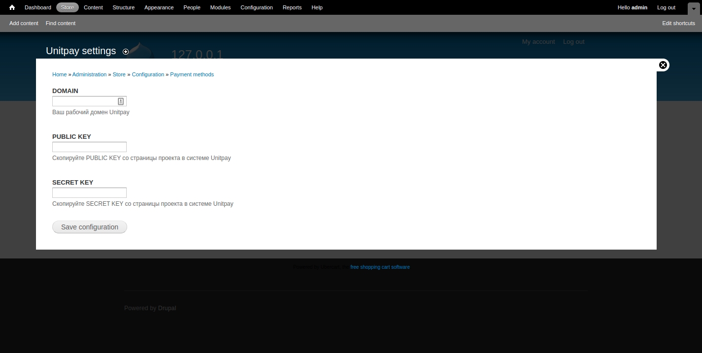 4. В поле DOMAIN вставьте значение unitpay.ru. В поля PUBLIC KEY и SECRET KEY скопируйте публичный и секретный ключ, которые вы можете взять из личного кабинета UnitPay. Нажмите на кнопку "Save configuration".