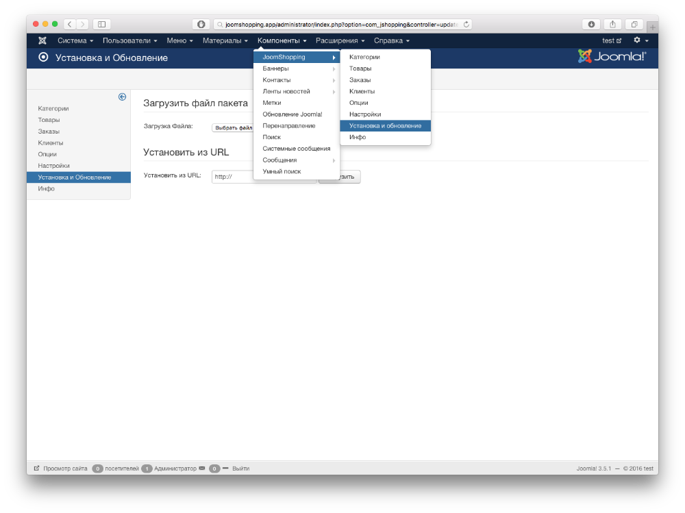 3. Установите модуль. Для этого перейдите в Компоненты-> Joomshopping-> Установка и обновление. Затем нажмите на кнопку "Выбрать файл" и после выбора нажмите кнопку "Загрузить".