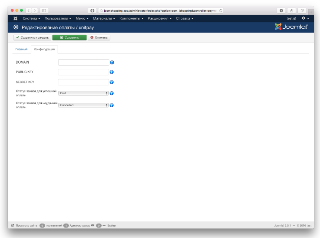 4. После этого перейдите в Компоненты-> Joomshopping-> Опции. Далее выберите "Список оплаты" и в появившемся списке найдите unitpay и кликните по ссылке. В открывшемся окне настроек перейдите на вкладку "Конфигурация". В поле DOMAIN вставьте значение unitpay.ru. Также впишите PUBLIC KEY и SECRET KEY, которые вы можете взять в личном кабинете на сайте unitpay.ru. Также здесь вы можете установить статусы, которые будут выдаваться в случае успешной и неудавшейся оплат. Для сохранения изменений нажмите на кнопку "Сохранить".