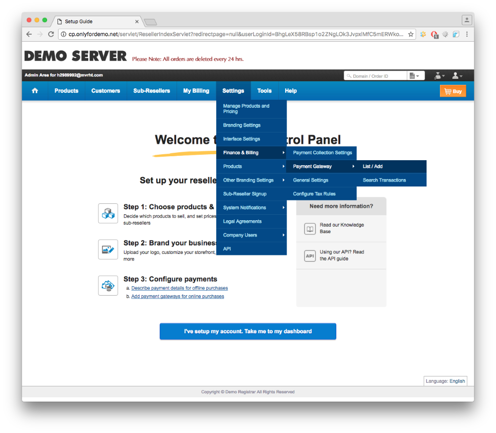 3. Перейти в панели LogicBoxes в меню settings->finance & billing->payment gateway->list/add.4. Нажать на кнопку "Аdd a gateway", в открывшемся окне внизу нажать "Add it now".
