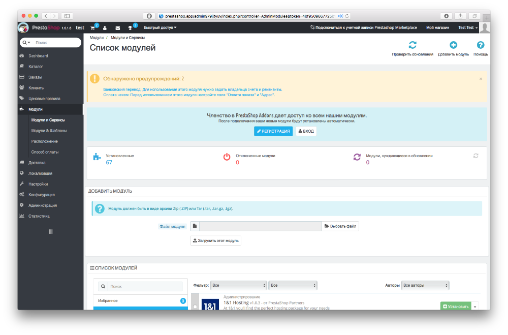 3. Нажмите кнопку «Модули» в левом меню панели управления, затем кнопку «Добавить модуль» в правом верхнем углу. Выберите скачанный файл модуля и нажмите «Загрузить этот модуль».
