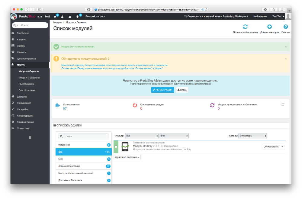 4. После успешной загрузки наберите в строке быстрого поиска слово unitpay, и вы найдете установленный модуль (в версии 1.7 модуль будет находиться внизу страницы).