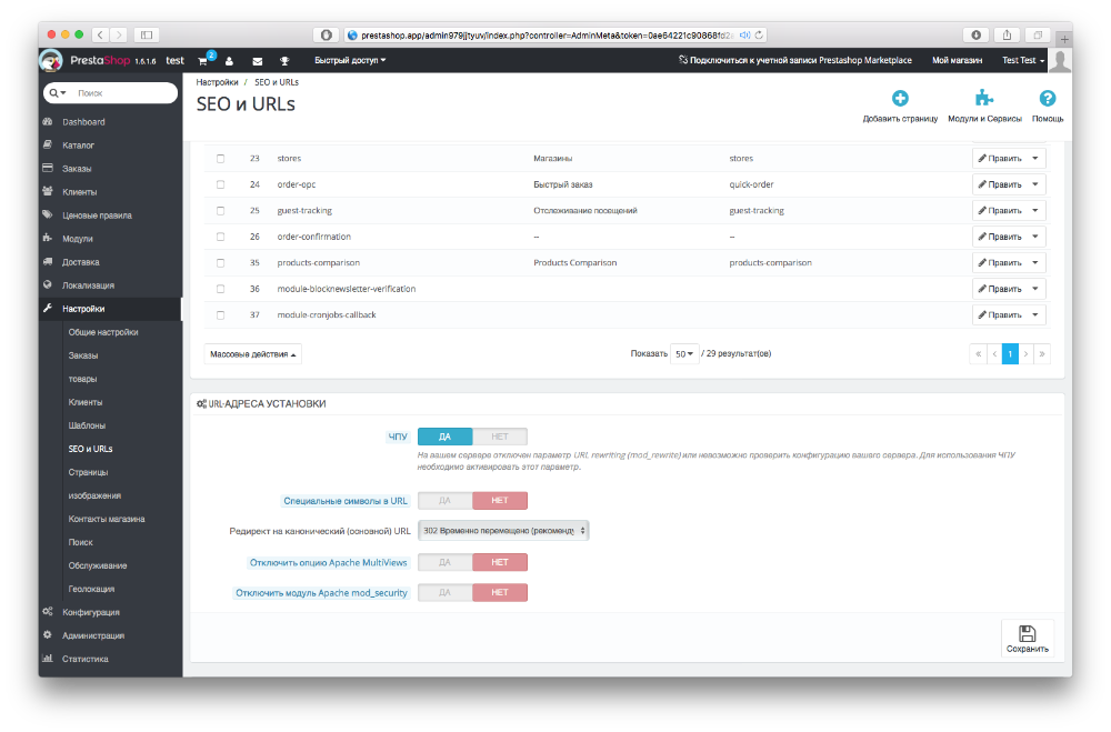 7. Для корректной работы модуля необходимо, чтобы были включены ЧПУ. Для этого перейдите в Настройки-> SEO-> URLs и включите ЧПУ.