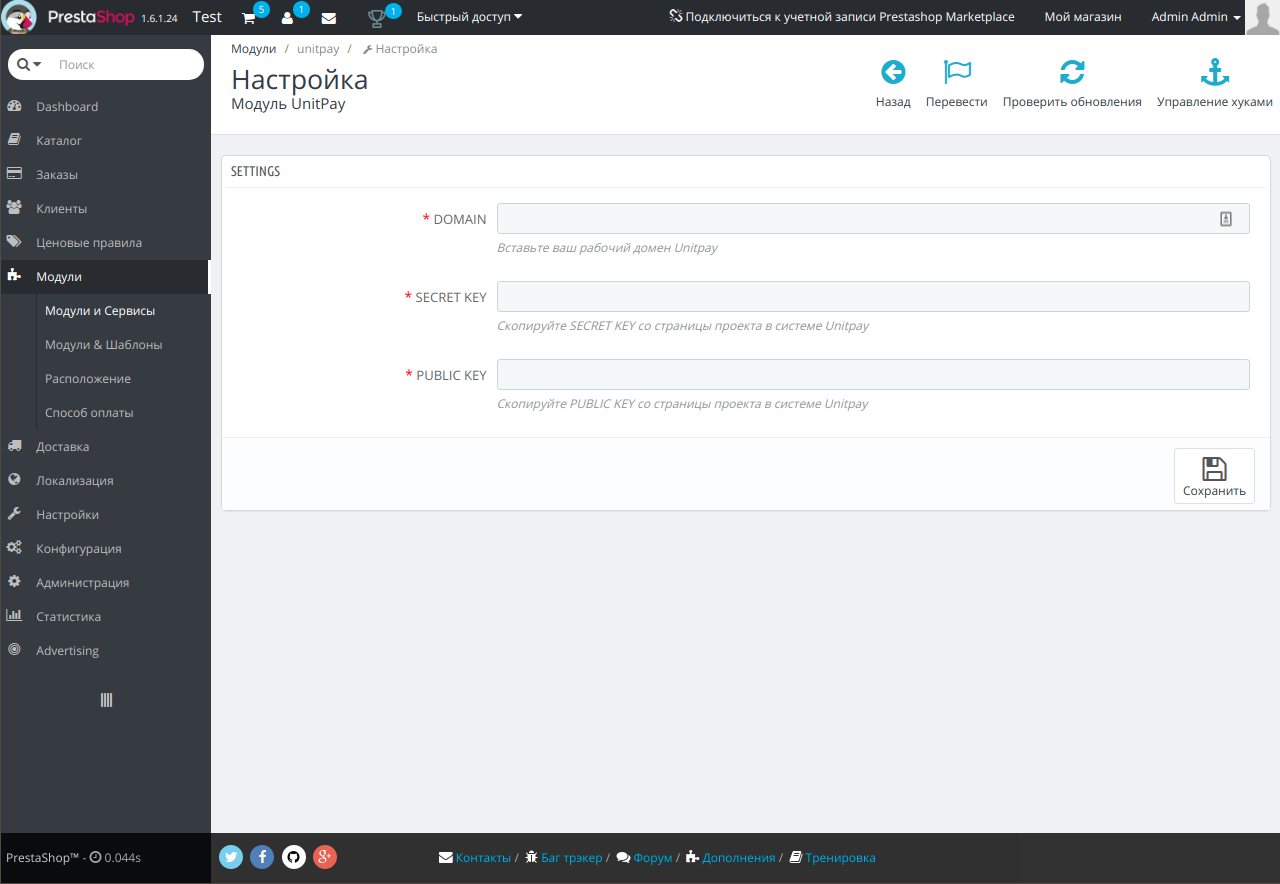 6. После успешной установки вы попадете на страницу настроек модуля. Здесь вам нужно ввести домен (unitpay.ru), secret key и public key, которые нужно взять на странице проекта в личном кабинете учетной записи unitpay. После ввода нажмите кнопку «Сохранить».