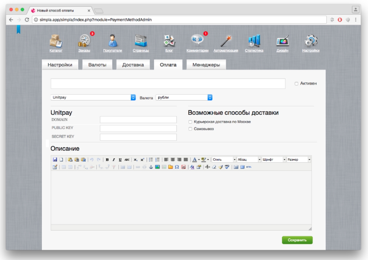 5. В способах оплаты выберите Unitpay, а также введите DOMAIN (unitpay.ru), PUBLIC KEY и SECRET KEY, которые вы можете взять в личном кабинете на сайте Unitpay.ru.