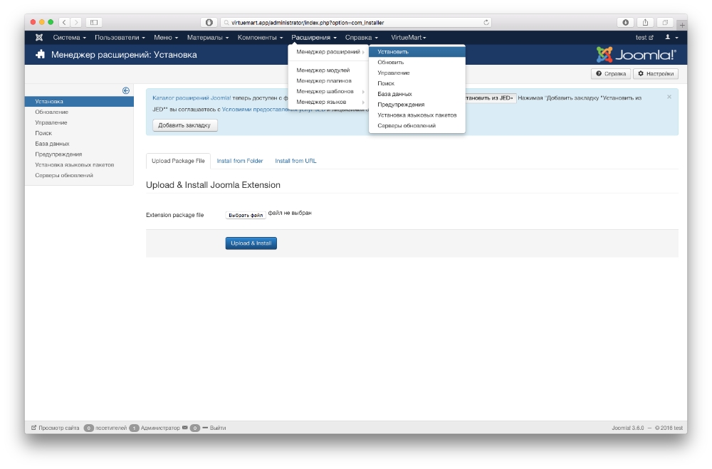 3. Установите модуль. Для этого перейдите в Расширения->Менеджер расширений->Установить. Затем нажмите на кнопку "Выбрать файл" и после выбора нажмите кнопку Upload & Install