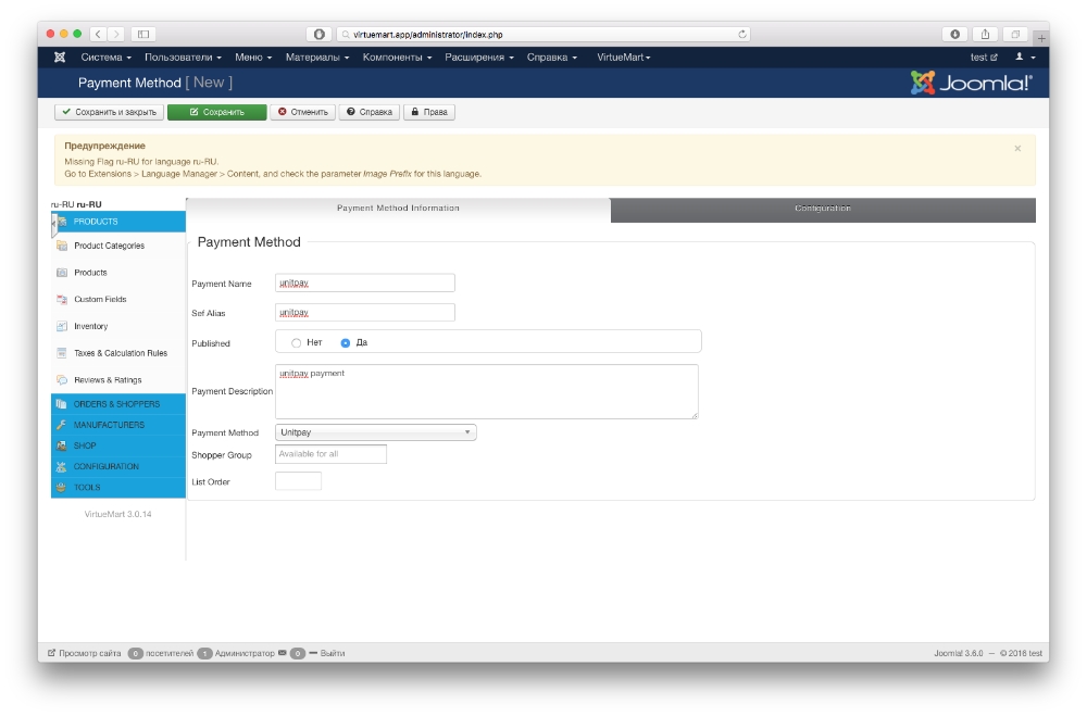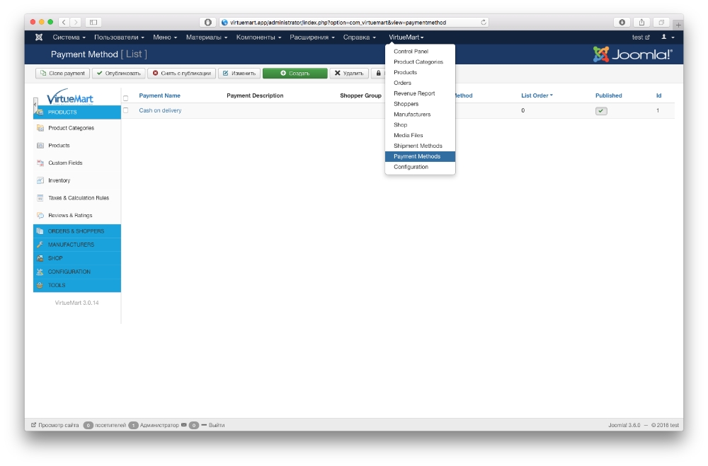 4. Далее перейдите в верхнем меню в VirtueMart->Методы оплаты