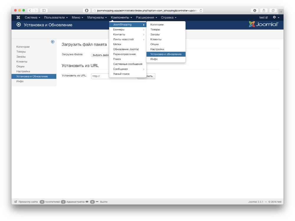 3. Установите модуль. Для этого перейдите в Компоненты-> Joomshopping-> Установка и обновление. Затем нажмите на кнопку "Выбрать файл" и после выбора нажмите кнопку "Загрузить".