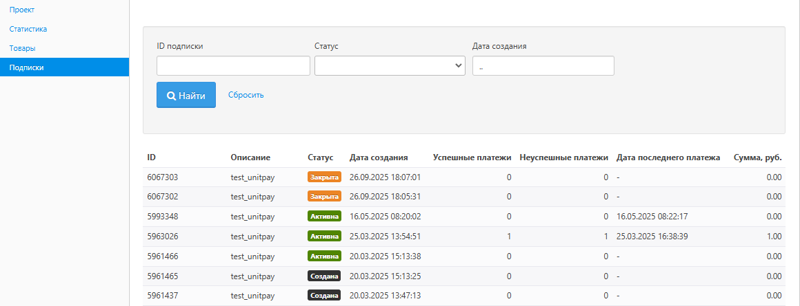 После подключения рекуррентных платежей (подписок) по [API](https://help.unitpay.ru/payments/recurring-payments/create-subscription) вам станет доступен раздел подписок.